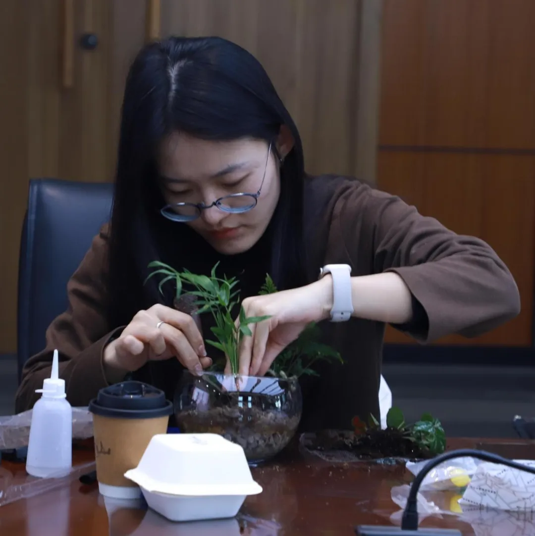 活動(dòng)特邀專業(yè)指導(dǎo)師全程教學(xué),指導(dǎo)老師詳細(xì)地向大家講解了微景觀的制作步驟和注意事項(xiàng)。在講師的耐心指導(dǎo)下,大家先在透明玻璃盆底部鋪上一層薄薄的小石子作為瀝水層,以確保植物能夠良好地生長;接著用種植土填滿盆內(nèi)的大部分空間,為綠植提供充足的養(yǎng)分;隨后,大家小心翼翼地將綠植放入盆中,根據(jù)自己的審美和創(chuàng)意,將植物擺放成高低錯(cuò)落的層次感;最后,在微景觀中增添一些可愛的卡通玩偶,讓整個(gè)景觀顯得更加生動(dòng)有趣。在輕松歡快的空間里,全體女職工放下工作壓力,以巧思妙想構(gòu)筑春日盛景,一盆盆綠植在女職工們的指尖流轉(zhuǎn)成詩意盎然的藝術(shù)佳作。